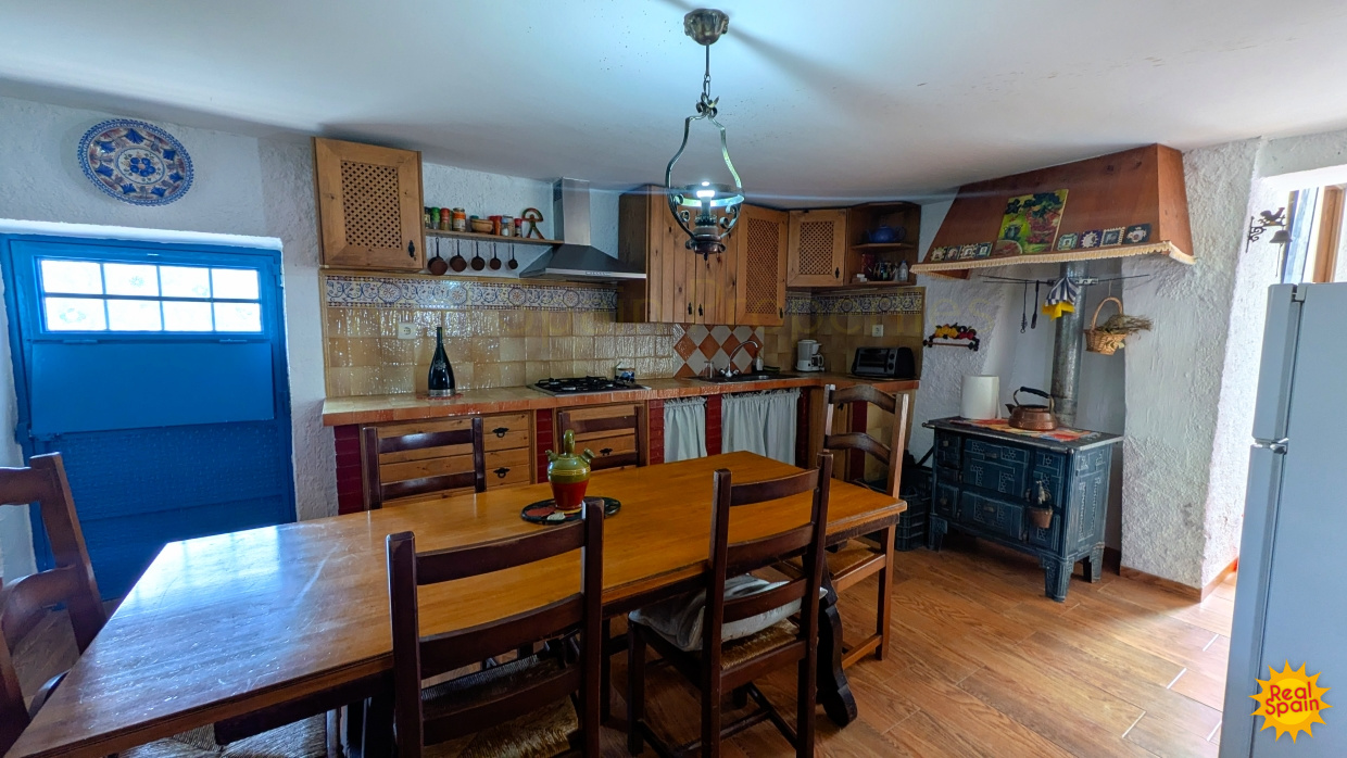 The farmhouse itself is warm and inviting. On the ground floor, you’ll find a cosy sitting–dining room with a traditional fireplace, a farmhouse-style kitchen full of character, two generously sized bedrooms, and a family bathroom. Upstairs, there is an additional bedroom, perfect for guests or a private retreat.